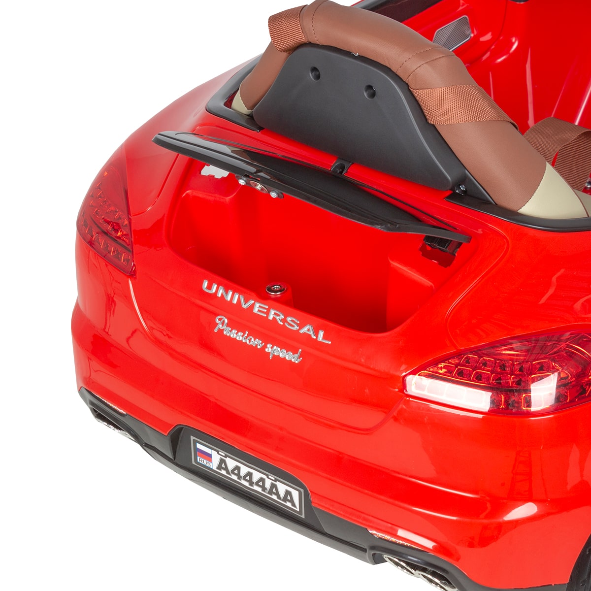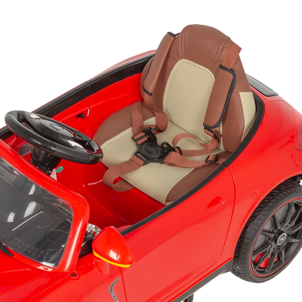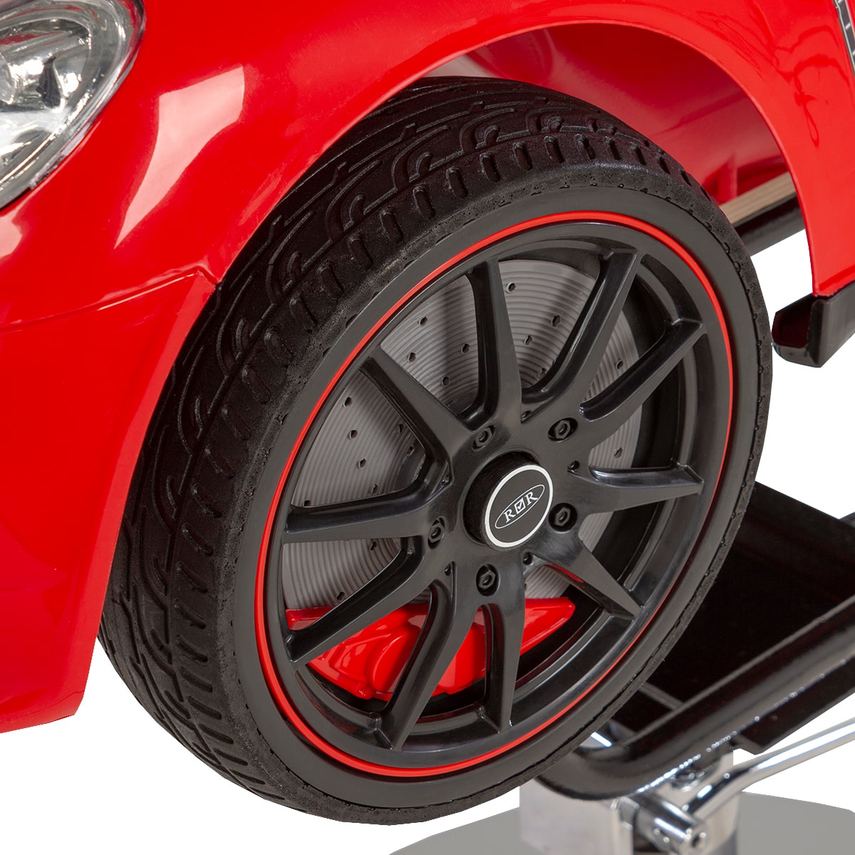 - Машинка: оснащена удобным сиденьем с удерживающим ремнем, рулем, приборной панелью, фарами и задними фонарями, магнитолой и колонками, колесами.