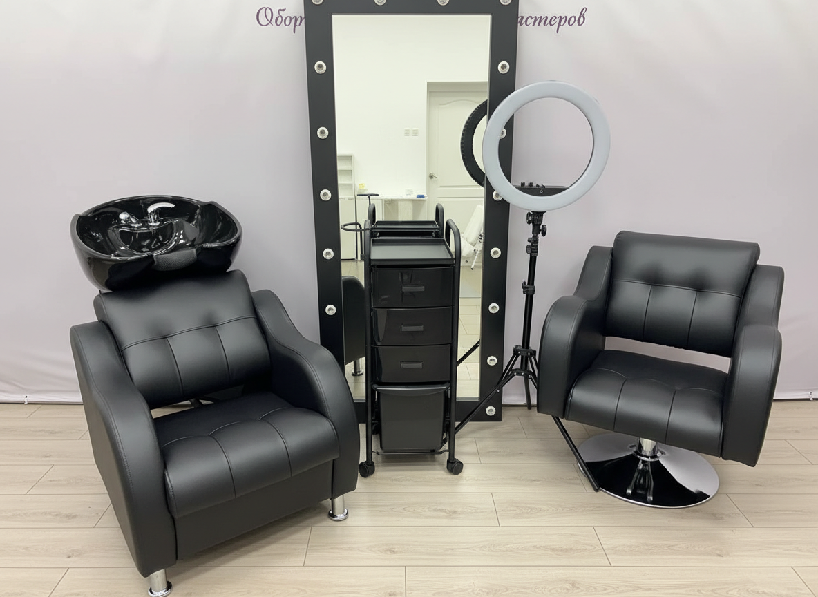 1. Парикмахерское кресло-мойка с глубокой раковиной. Экокожа бизнес-класса (Nice 600 (черный). Длина 90 см, ширина 70 см, высота 96 см. Размеры раковины: длина 56 см, ширина 55 см, глубина 24 см, шейный вырез 17 см.