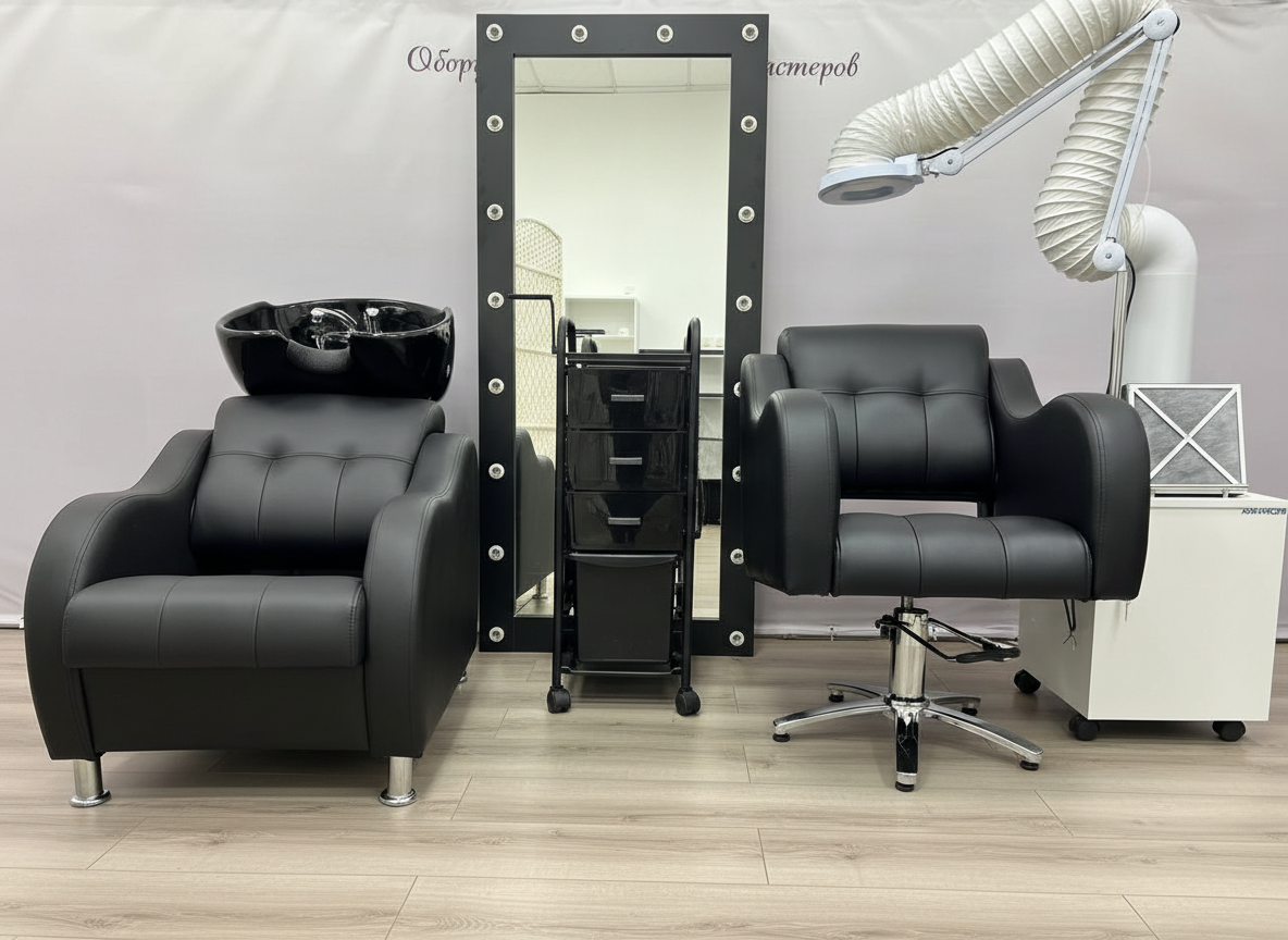 1. Парикмахерское кресло-мойка с глубокой раковиной. Экокожа премиум-класса (MARVEL BLACK). Длина 90 см, ширина 70 см, высота 96 см. Размеры раковины: длина 56 см, ширина 55 см, глубина 24 см, шейный вырез 17 см.