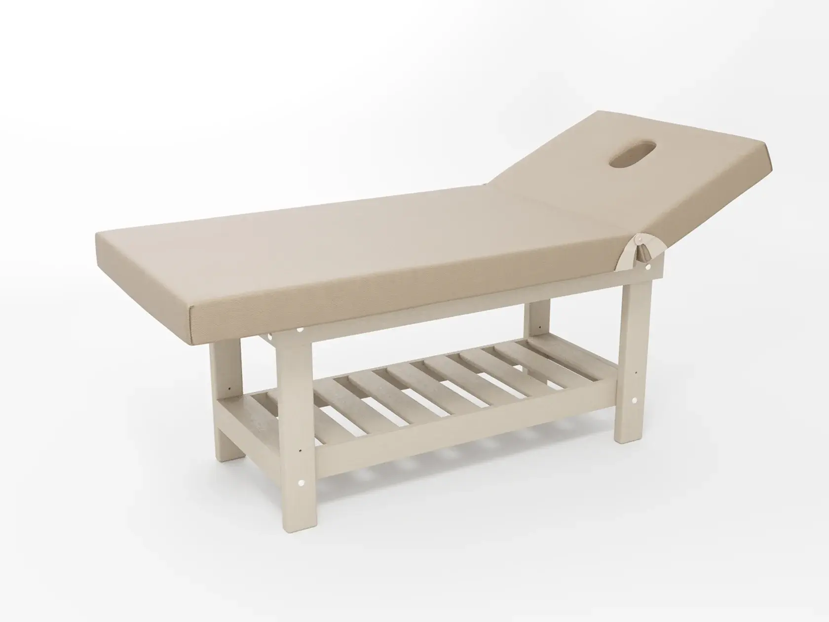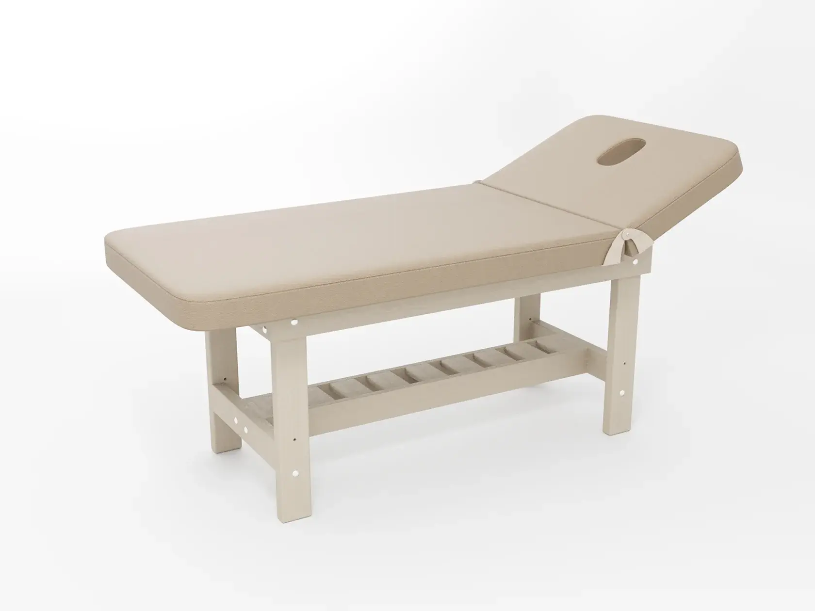 Стандарт / сплошная (без спинки) / закругленные / без регулировки (индивидуальная высота кушетки) / широкая полочка-решетка / с люверсом, заглушкой и подушкой-заглушкой