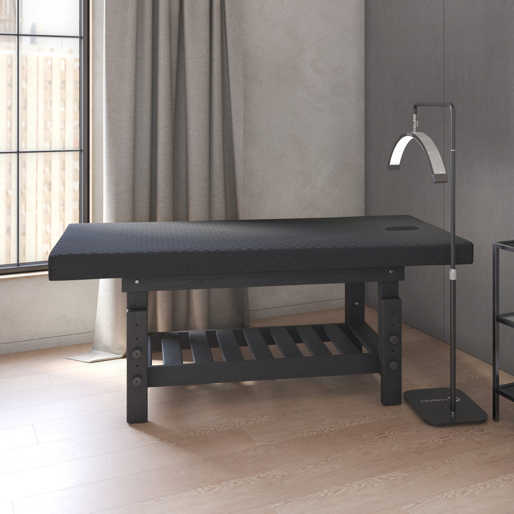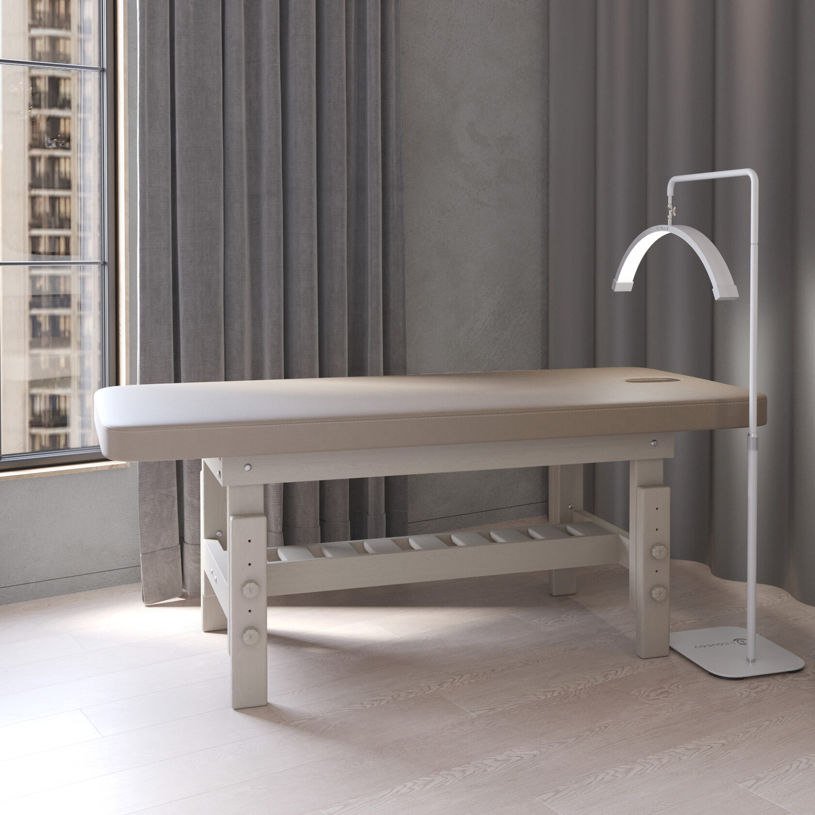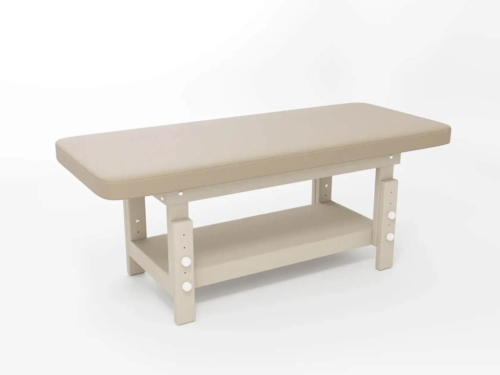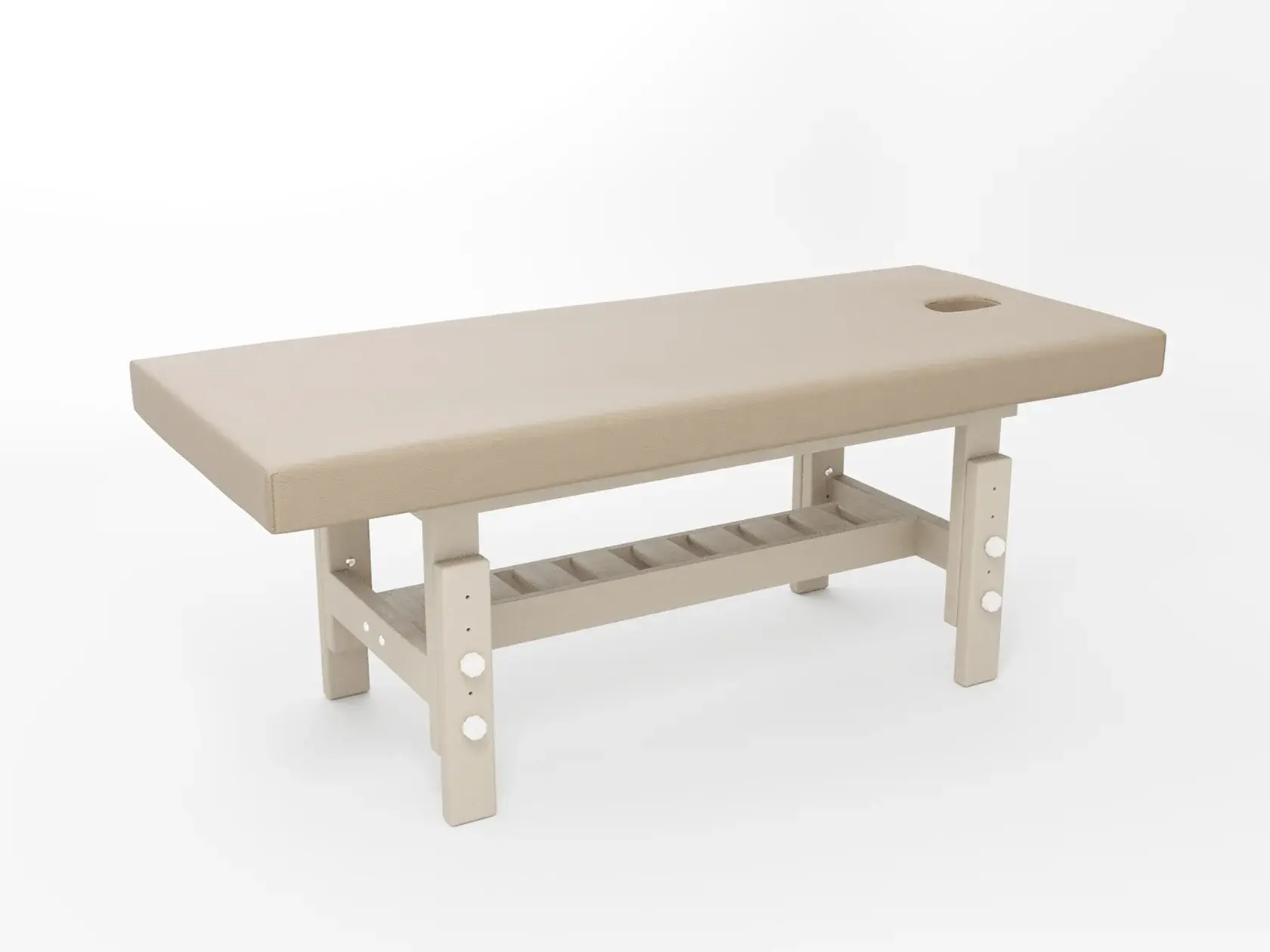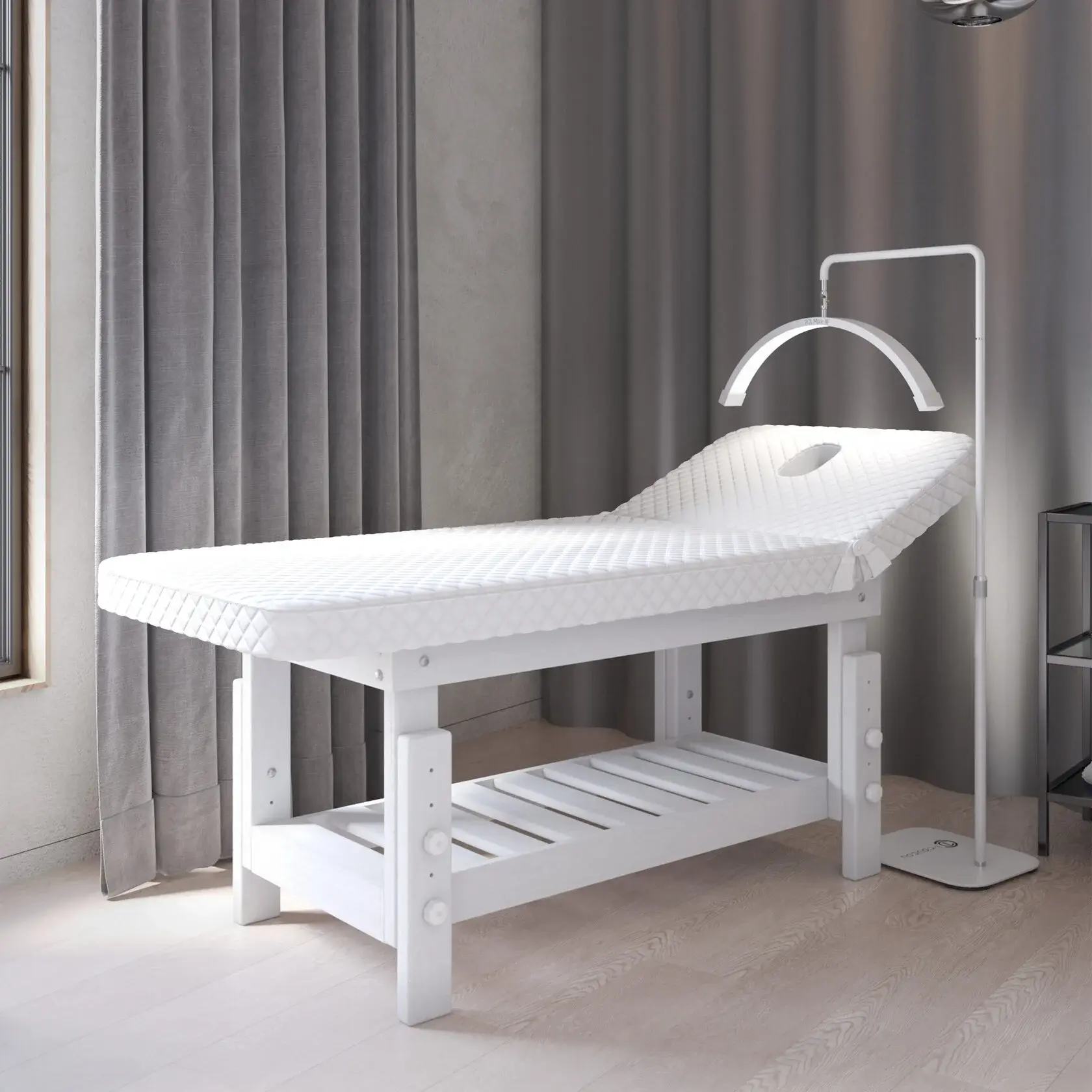Премиум / сплошная (без спинки) / закругленные / без регулировки (индивидуальная высота кушетки) / широкая полочка-решетка / с люверсом и заглушкой