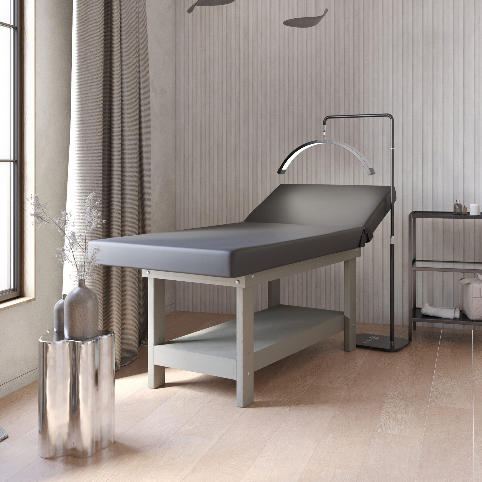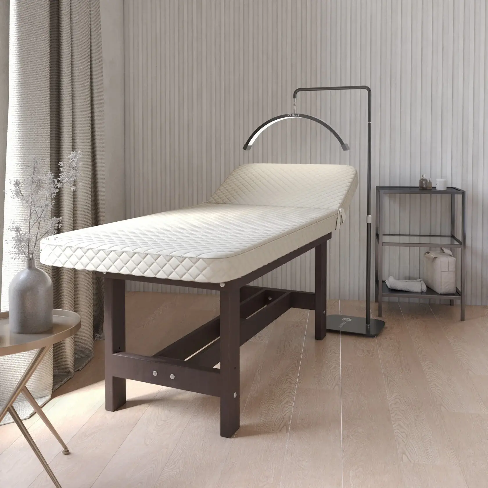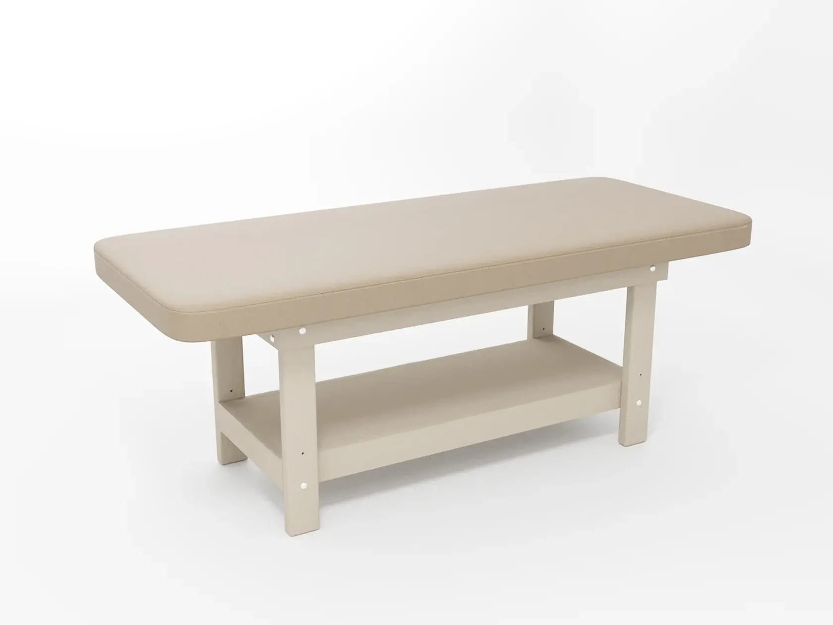 Премиум / сплошная (без спинки) / закругленные / без регулировки (индивидуальная высота кушетки) / узкая полочка без заполнения / с люверсом и заглушкой